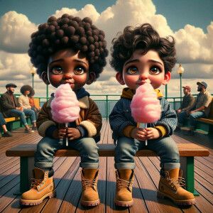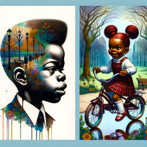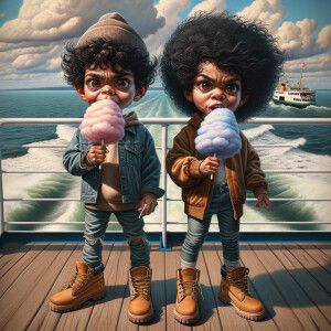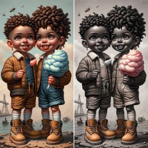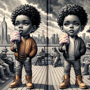 «Grisaille Painting: Riding on the ferry landscape. Create a boy...»