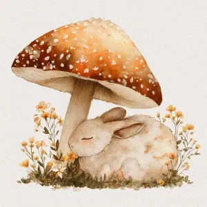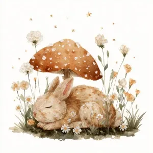 «Fluffy rabbit sleeping under spotted mushroom, watercolor style,...»
