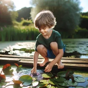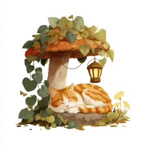«Small orange tabby cat stretching lazily under spotted mushroom,...»