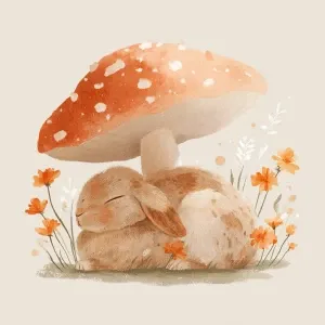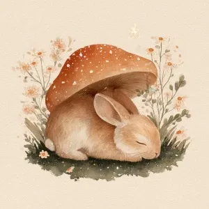 «Sleeping fluffy rabbit under spotted mushroom, small wildflowers...»