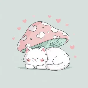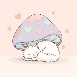 «cute chubby white cat sleeping under a pastel pink mushroom with...»