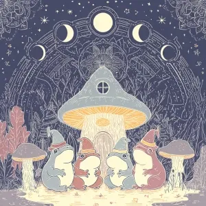«five wise cartoon frogs in wizard hats sitting under glowing mus...»