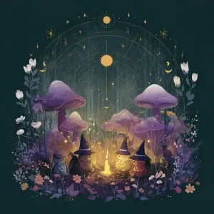 «Detailed nighttime forest scene: a circle of mushrooms glowing u...»