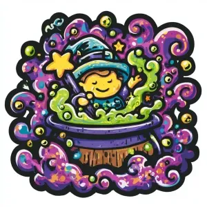 «sticker design, hand-drawn wizard brewing coffee in a cauldron,...»