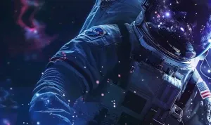 «lone astronaut drifting in deep space, tethered to a small glowi...»