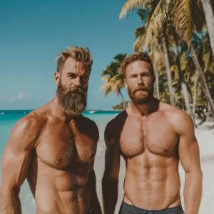 «Two muscular bodybuilders standing side by side in a vibrant Haw...»