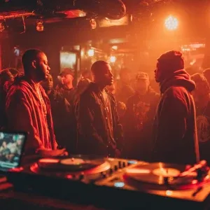 «Three urban rap artists are standing in a circle at a small, smo...»