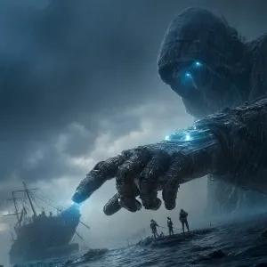 «A colossal, shadowy, hooded figure with glowing blue eyes and a...»