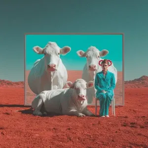 «Surreal pop-art scene on vivid red desert under a turquoise sky,...»