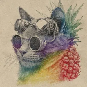 «A steam punk sketch of a cat mixed with a pineapple. Sunglasses,...»