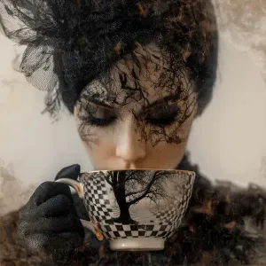 «Colorsplash double exposure steamy cup of coffee, goth elements,...»