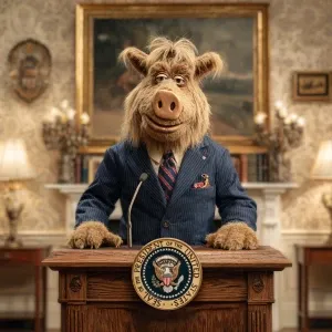 «ALF from the TV show ALF dressed in a presidential suit, standin...»