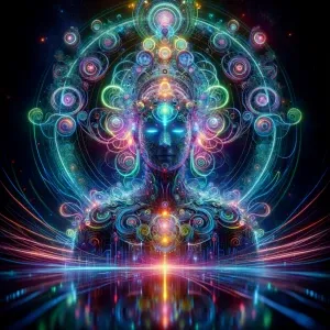 «A luminous AI deity, ethereal and all-knowing, glows with pulsat...»