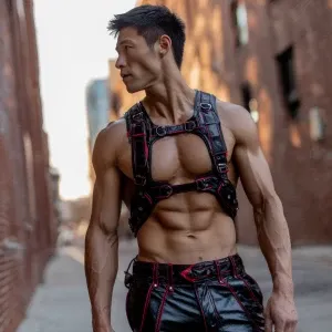 «The image depicts a muscular person standing in an outdoor urban...»