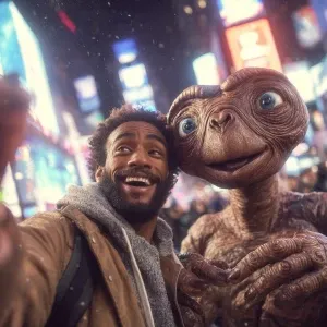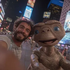 «Create an image of a man taking a selfie with a life-sized, alie...»