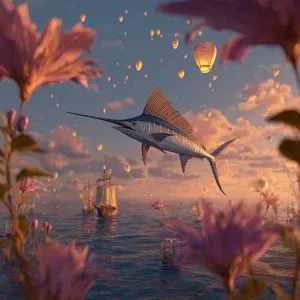 «A sleek, silvery sailfish soaring through a dreamlike sky above...»
