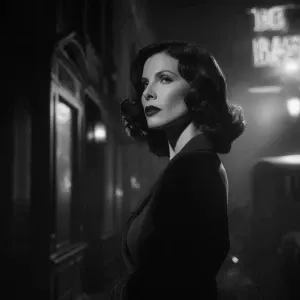 «Ultra-realistic noir portrait of a mysterious woman, elegant vin...»