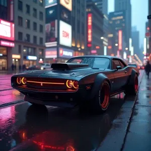 «Futuristic cyberpunk muscle car with hood scoop, neon lights, ma...»