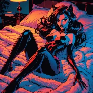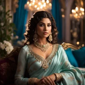 «create a image shows a woman seated on a bed in an elegant setti...»