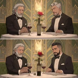 «Make two bodybuilder men both gray hair one with long wavy hair...»