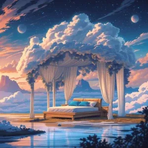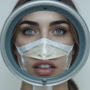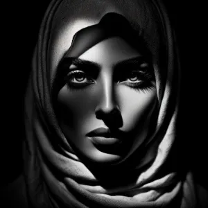 «Create an intense close-up portrait of a woman surrounded by dee...»