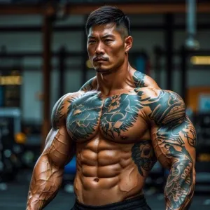 «Tall muscular Asian man with tattoos»