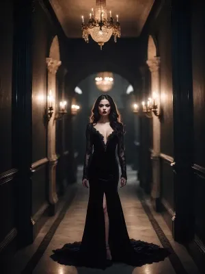 «A full-body cinematic shot of a stunning brunette vampire walkin...»