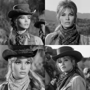«Brigitte bardot in a western movie, black and white, four Frames»