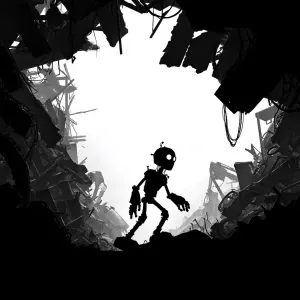 «A small, all-black robot silhouette gathers metal debris around...»