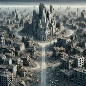 «A vast, abandoned cityscape. Crumbling buildings fill the enviro...»
