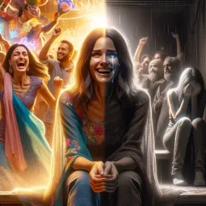«A person smiling in public but crying alone in a dimly lit room...»