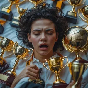 «A person surrounded by trophies but with a hollow face — success...»