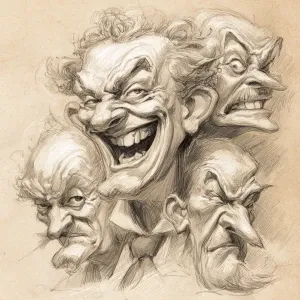 «Caricature with grossly hideous face, laughing, and frowning, se...»