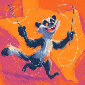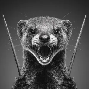 «A anthropomorphic mongoose with a wild, crazy smile and intense...»