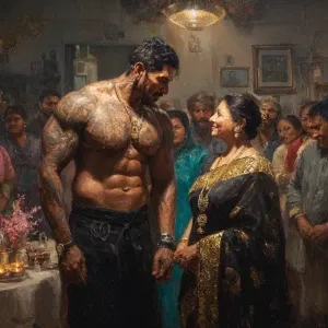 «Realism,oil painting.a muscular beefy sweaty tattoed indian man...»