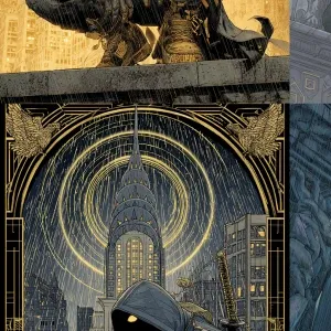 «A masked vigilante ninja in a crouching pose perched atop an ove...»