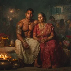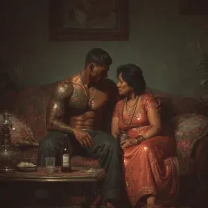 «Realism,digital painting.a muscular beefy sweaty tattoed indian...»