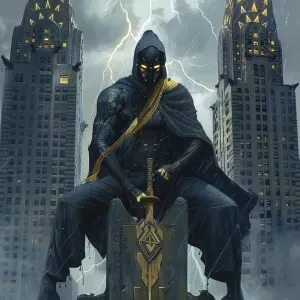 «Manga-style noir detective crouched on a gilded Art Deco gargoyl...»