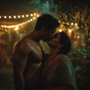 «a muscular, sweaty Indian man standing in a corner of a garden w...»