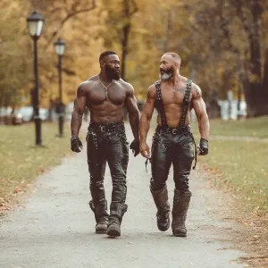 «Two gray bodybuilder muscle, bearded, men walking in the park wi...»