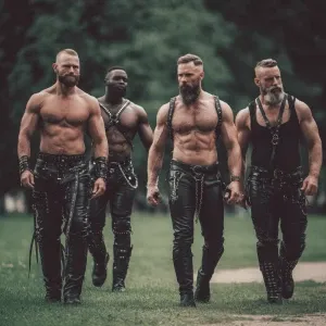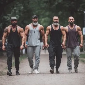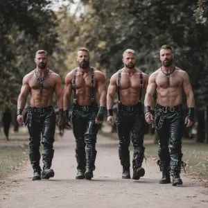 «Four bodybuilder muscle, bearded, men walking in the park with l...»
