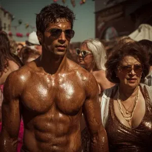 «Hyperealism,a muscular beefy kashmiri son in law walking ,with h...»