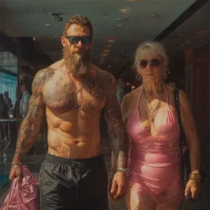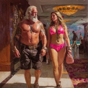 «Hyperrealism painting, a muscular Russian man in his beach hotel...»
