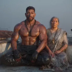«Hyperrealism image.a muscular beefy tattoed gujarati sweaty man...»