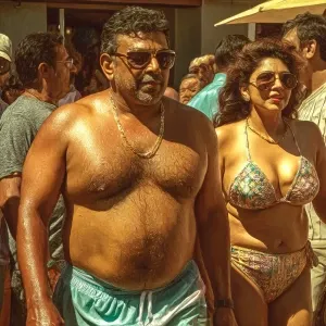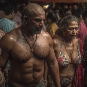 «Hyperrealistic image,a muscular beefy kerela son in law walking...»