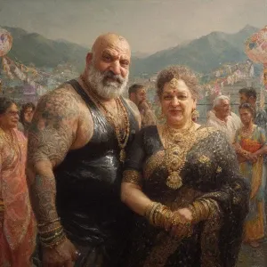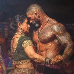 «Hyperrealistic oil painting.a muscular beefy tattoed gujarati sw...»