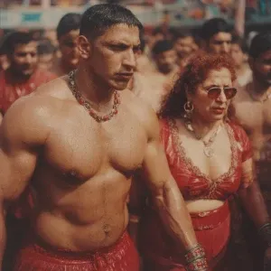 «Hyperrealism photorealism.a beefy muscular sweaty criminal gujar...»