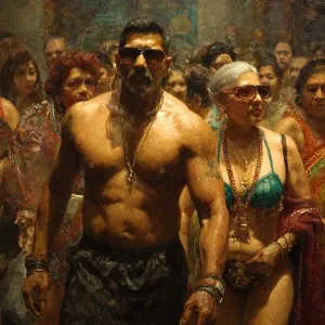 «Hyperrealistic painting.a beefy muscular sweaty criminal gujarat...»
