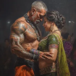 «Hyperrealistic oil painting.a muscular beefy tattoed gujarati sw...»