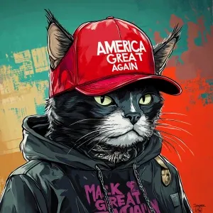 «A humanoid cat character wearing a red baseball cap with "MAKE A...»